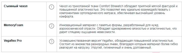 - Материалы пеноматериал (Vegaflex Pro), пеноматериал с памятью формы (MemoryFoam)