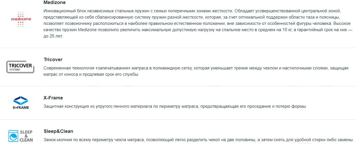 • Технологии X-Frame (Vegas), Sleep&Clean (Vegas), Tricover (Vegas), Medizone (Vegas)