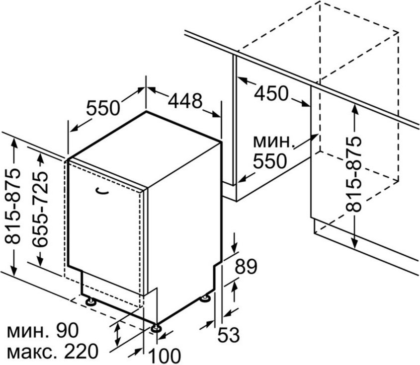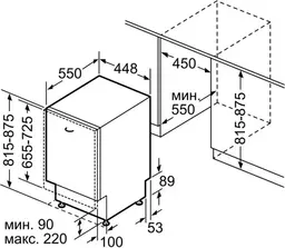 Встраиваемая посудомоечная машина, Вместимость комплектов посуды 9, расход воды за цикл 8.5 л, класс энергопотребления А, класс мойки A, класс сушки A, электронное управление, инверторный двигатель, защита от детей, программа интенсивной мойки, уровень шума 46 дБ, ширина 44.8 см, глубина 55 см, высота 81.5 см.