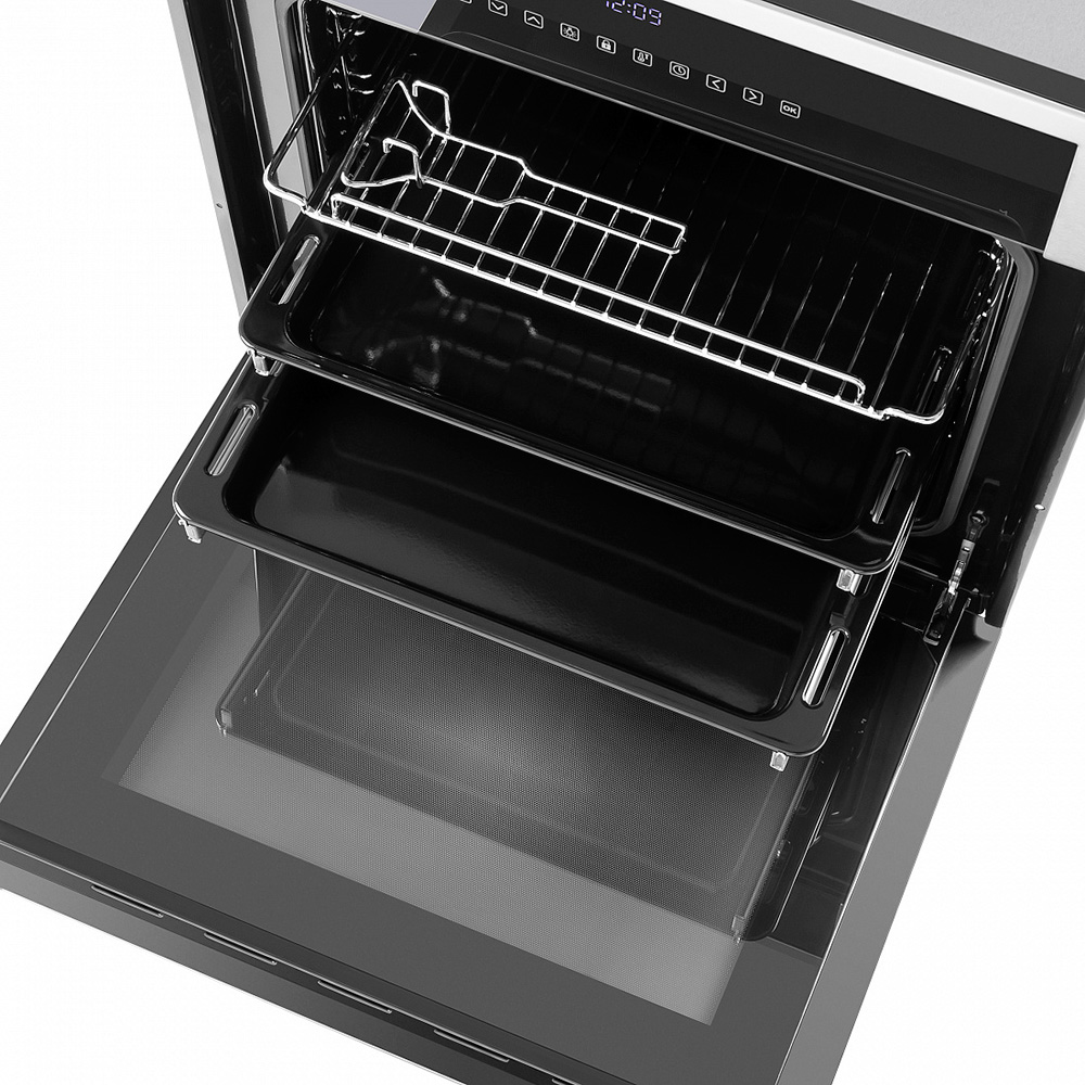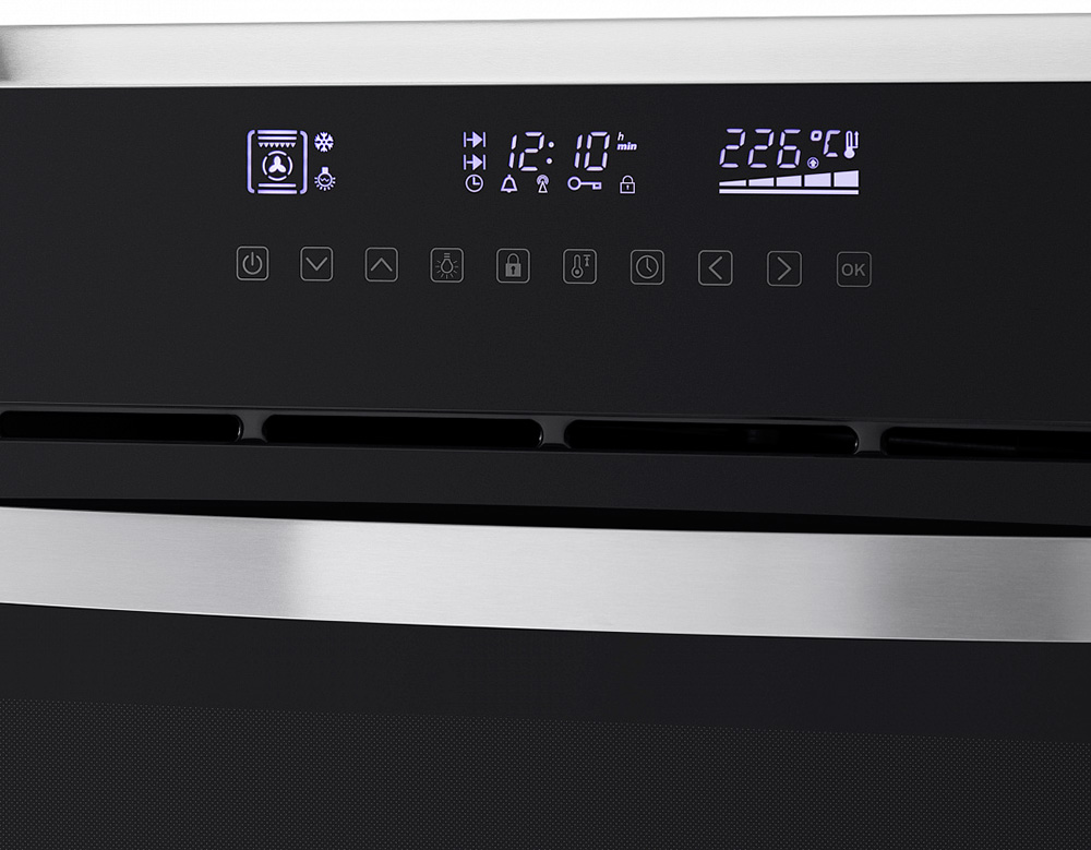 Электрический духовой шкаф, объем 58 л, класс энергопотребления A, максимальная температура 250 °С, способ очистки эмаль легкой очистки, переключатели сенсорные, количество стекол 2, гриль электрический, телескопические направляющие, дверца духовки откидная, дисплей, таймер с отключением, защита от детей, ширина ниши для встраивания 56 см.