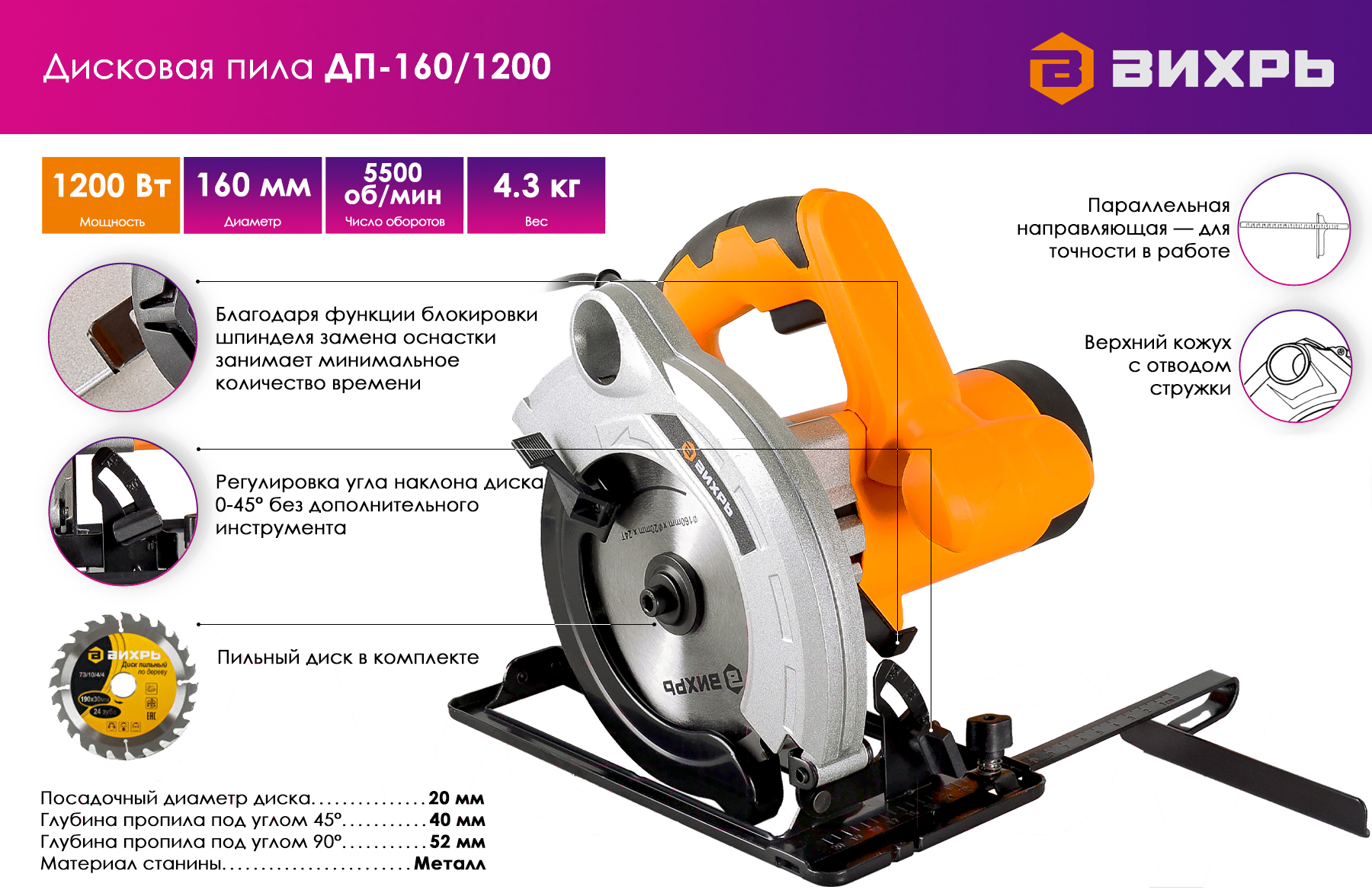 Дисковая пила Вихрь ДП-160/1200 (72/11/8)