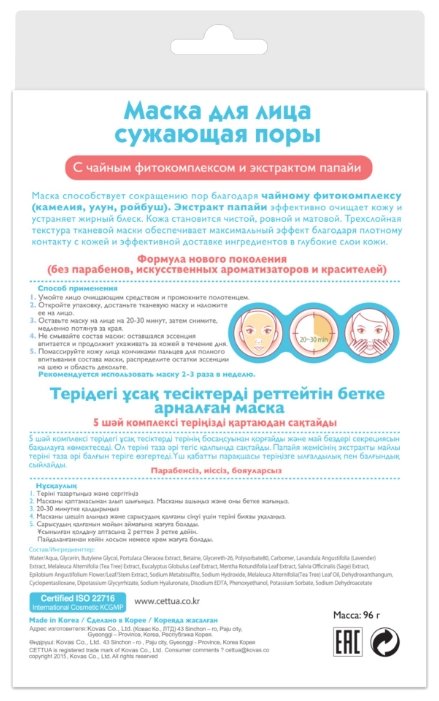 - Способ применения умойте лицо очищающим средством и промокните полотенцем. Откройте упаковку, достаньте тканевую маску и наложите ее на лицо. Оставьте маску на лице на 20-30 минут, затем снимите, медленно потянув за края. Не смывайте состав маски: оставшаяся эссенция впитывается и продолжит ухаживать за кожей в течение дня. Помассируйте кожу лица кончиками пальцев для полного впитывания состава маски, распределите остатки эссенции на шею и область декольте. Рекомендуется использовать маску 2-3 раза в неделю