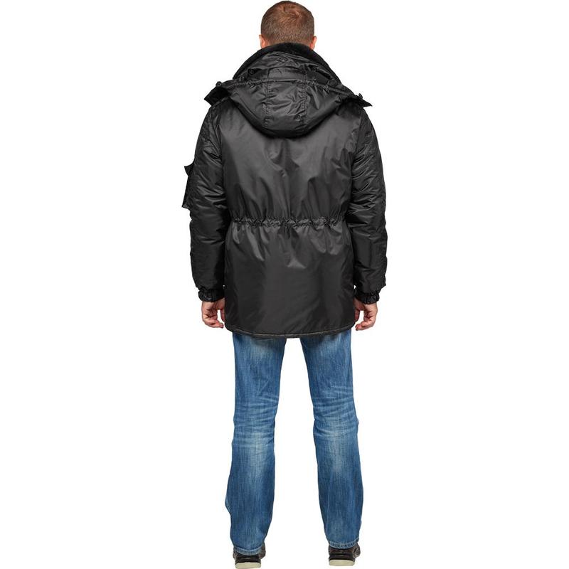 Куртка для охраны з42-КУ предназначена для защиты работающих от пониженных температур в различных отраслях промышленности, изготавливается в соответствии с ГОСТ 12. 4. 303–2016 «Одежда специальная для защиты от пониженных температур». Куртка прямого силуэта, удлиненная, с центральной бортовой застежкой на однозамковую молнию и с 2 ветрозащитным клапанами, застегивающийся на 4 металлические клепки. Нижняя часть куртки обработана швом в подгибку с закрытым срезом. Полочка с двумя нагрудными карманами, с клапанами, застегивающиеся на кнопку. По центру кармана наличие встречной складки для придания объема. Наличие двух нижних накладных карманов с клапанами, застегивающийся на клепку (карманы объемные «книжка»). По линии талии наличие кулисы регулирующая при помощи шляпной резинки и 2 дырчатого фиксатора. Рукав двухшовный, втачной с притачной манжетой регулирующийся эластичной тесьмой. На левом рукаве наличие накладного кармана с клапаном, застегивающийся на клепку. По низу кармана располагается стропа с полукольцом. По плечевым швам вставлены погоны с кнопками. Воротник притачной меховой со съемным капюшоном, пристегивающийся на молнию. Капюшон трехшовный на стойке, застегивающийся на контактную ленту, с кулисой и шнурком по лицевой части и двумя двухдырчатыми фиксаторами. Плотность ткани: 100 г/кв.м. Отрасль: охранная деятельность.
