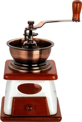 Жерновая кофемолка; регулятор степени помола; контейнер для молотого кофе.