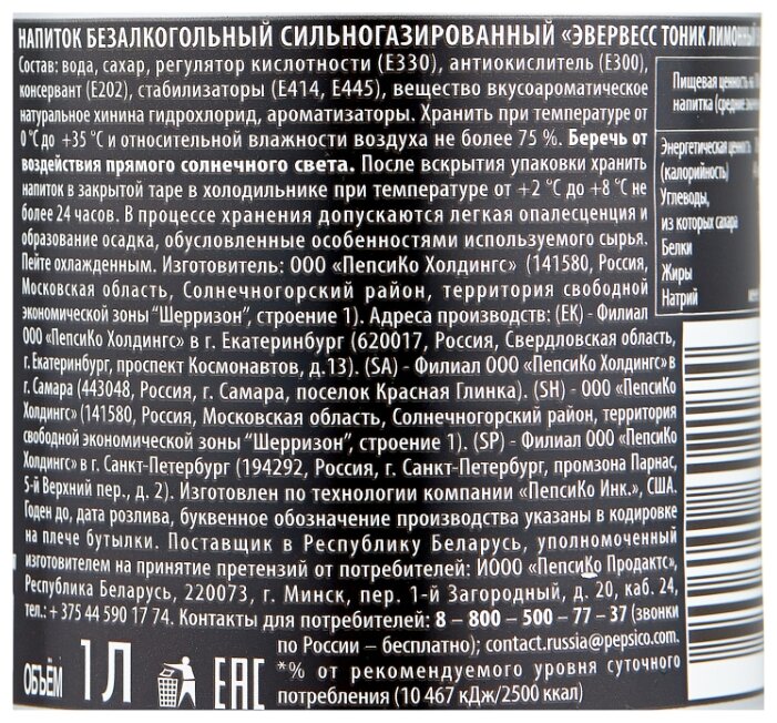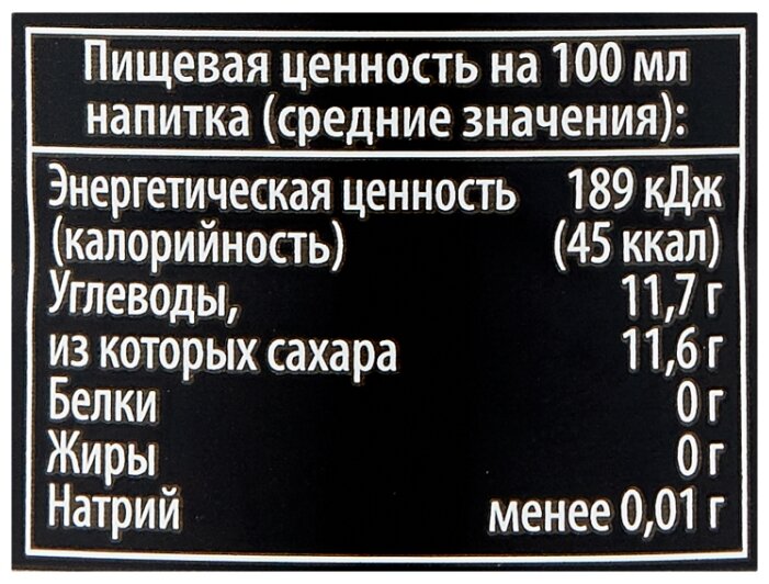• Состав вода, сахар, регулятор кислотности (Е330), консервант (Е202), антиокислитель (Е300), стабилизаторы (E414, E445), хинина гидрохлорид, ароматизаторы