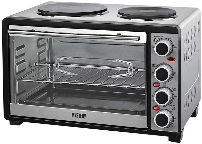 Мощность 1500 Вт; механическое управление; объем 30 л; регулируемый термостат; максимальная температура нагрева 250 °C; кол-во режимов 3; таймер 60 мин; конвекция; наличие конфорок; в комплекте: держатель для вертела, решетка, противень, вертел.