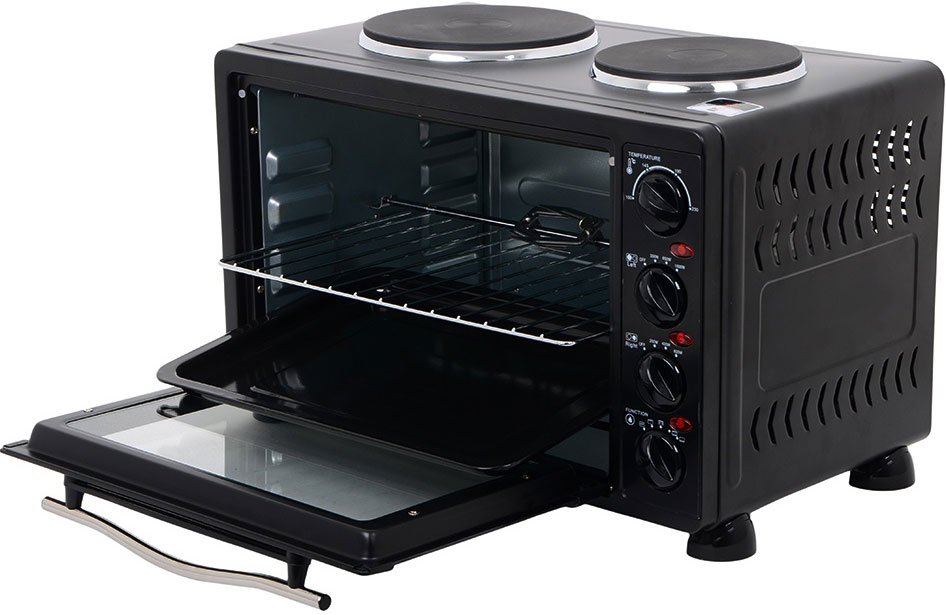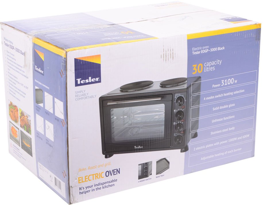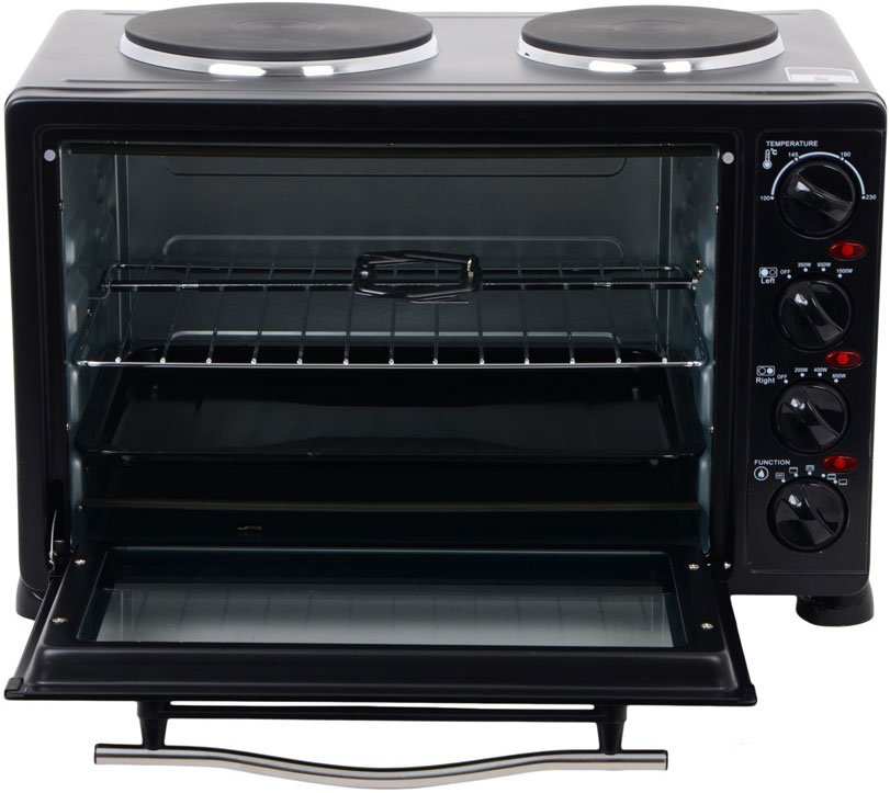 Мощность 3100 Вт; механическое управление; объем 30 л; регулируемый термостат; максимальная температура нагрева 230 °C; кол-во режимов 4; таймер 60 мин; внутреннее покрытие нержавеющая сталь; наличие конфорок; в комплекте: противень, решетка, вертел, держатель для вертела.