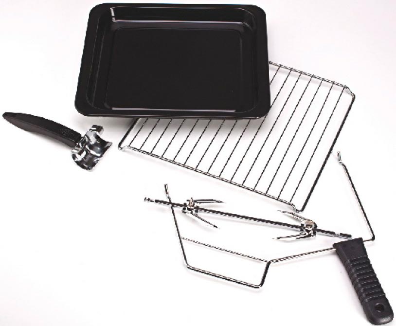 • В комплекте Держатель для вертела; Вертел; Поддон для крошек; Решетка; Противень