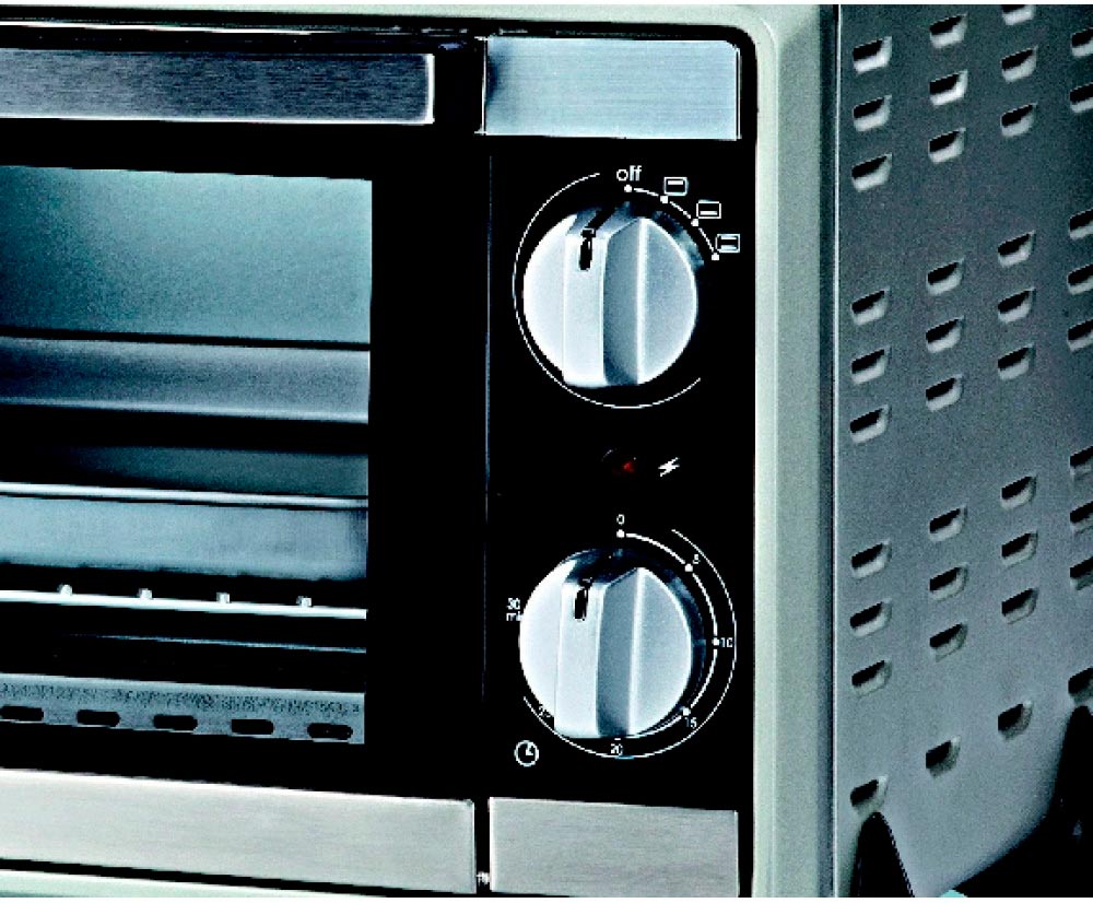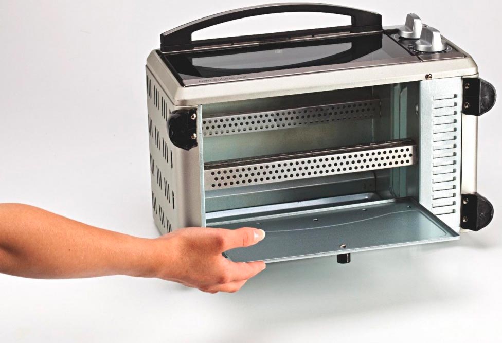 Мощность 1000 Вт; механическое управление; объем 10 л; регулируемый термостат; максимальная температура нагрева 230 °C; кол-во режимов 3; таймер 30 мин; в комплекте: противень, решетка, поддон для крошек.