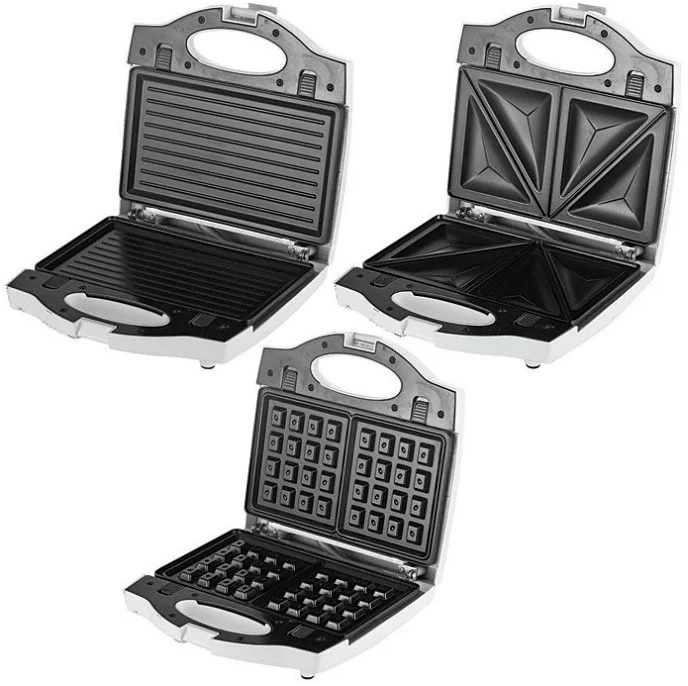 Сэндвичница, мощность 750 Вт, количество кусочков 4, съемные пластины, функция гриля, дополнительные пластины: для вафель, для гриля.
