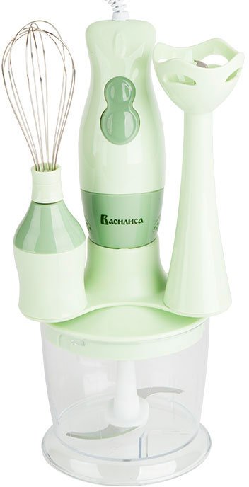 Погружной, мощность 400 Вт, количество скоростей 2, объем измельчителя 0.5 л, в комплекте: измельчитель, венчик-взбиватель.