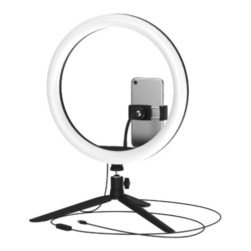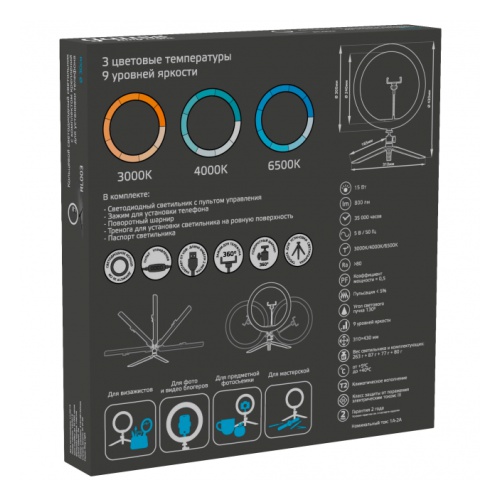 В комплекте: светодиодный светильник с пультом управления, зажим для установки телефона, поворотный шарнир, тренога