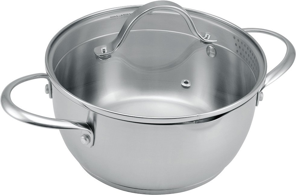 Объем: 1.7 л. Диаметр: 18 см. Подходит для посудомоечной машины. Материал корпуса: нержавеющая сталь. Тройное вштампованное капсулированное дно толщиной 5 мм, с прослойкой из алюминия 3,8 мм. Стеклянная крышка из жаропрочного стекла с отверстием для выхода пара. Носик и отверстия в ободке крышки упрощают слив жидкости.
