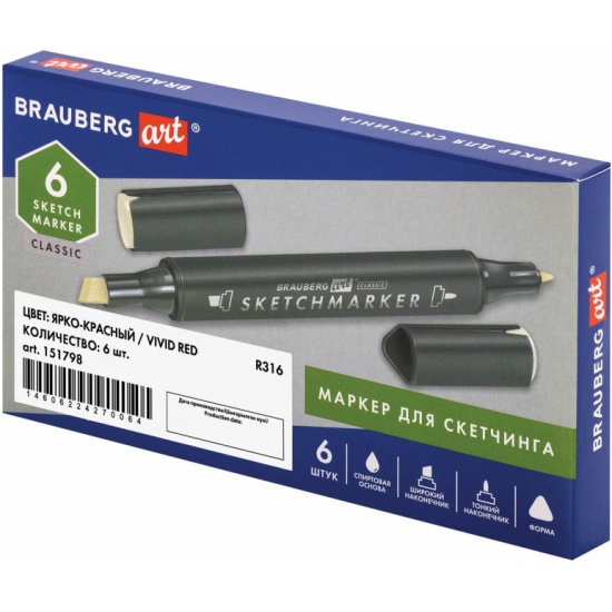 Маркер для скетчинга двусторонний 1 мм - 6 мм BRAUBERG ART CLASSIC, ЯРКО-КРАСНЫЙ (R316), 151798 151798СН