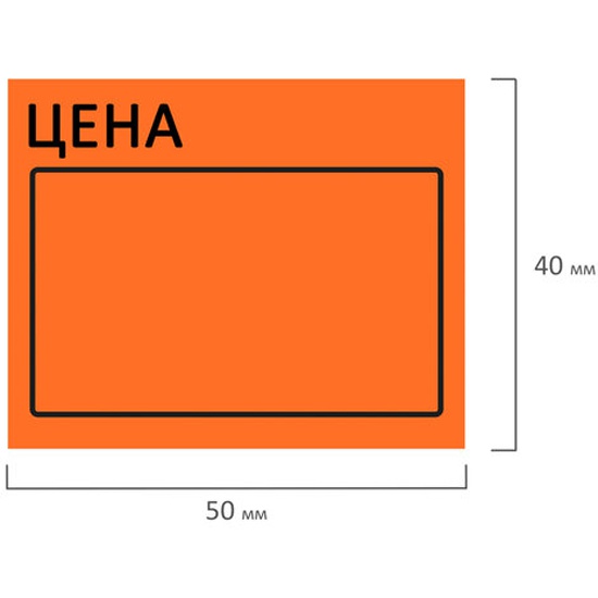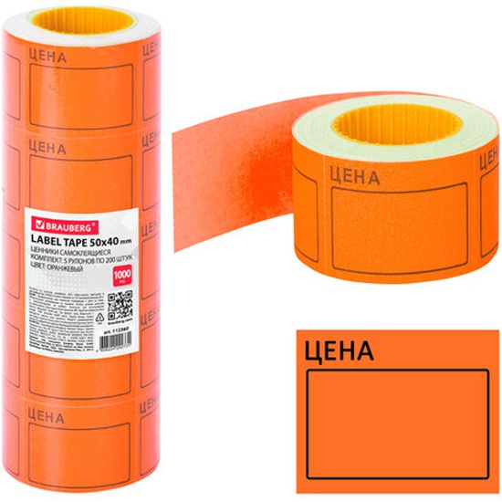 Ценник большой "Цена" 50х40 мм оранжевый самоклеящийся, КОМПЛЕКТ 5 рулонов по 200 шт., BRAUBERG, 112360 112360СН