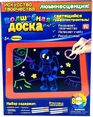 - Комплектация набора доска для рисования, салфетка, 30 шаблонов, руководство, 6 неоновых карандашей