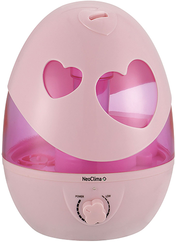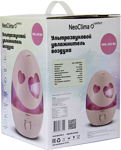 Увлажнитель воздуха NeoClima NHL-320SH приобретают в тех случаях, когда необходимо создать благоприятный микроклимат в помещении. Модель выполнена в розовом цвете с дизайном в виде сердечек. Компактный увлажнитель можно разместить на столе. Он способен беспрерывно работать на протяжении 10,5 часов. После этого пользователь должен добавить воду и выбрать подходящий режим. Расход воды составляет 300 мл/ч. Емкость резервуара — 3,2 литра. Корпус оснащен индикатором уровня воды.