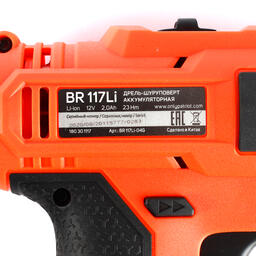 Данный шуруповерт оснащен одномуфтовым патроном с большим усилием зажима. Большую площадь освещаемой поверхности обеспечивают 2 светодиода, расположенных на корпусе шуруповерта, нижний светодиод направлен на область под патроном, обеспечивая лучшую видимость. Увеличенная аккумуляторная батарея с противоскользящим покрытием повышает устойчивость BR 117Li.