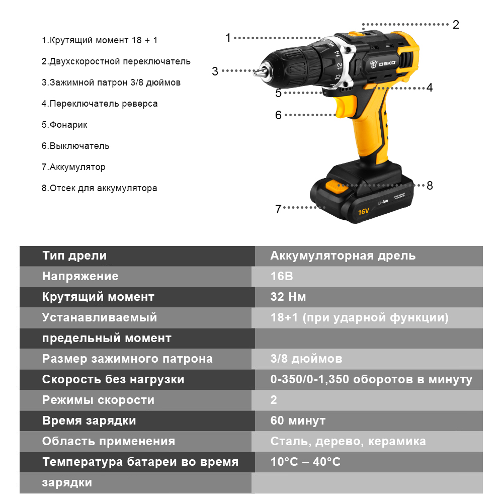 Дрель-шуруповерт аккумуляторная DEKO DKCD16FU-Li