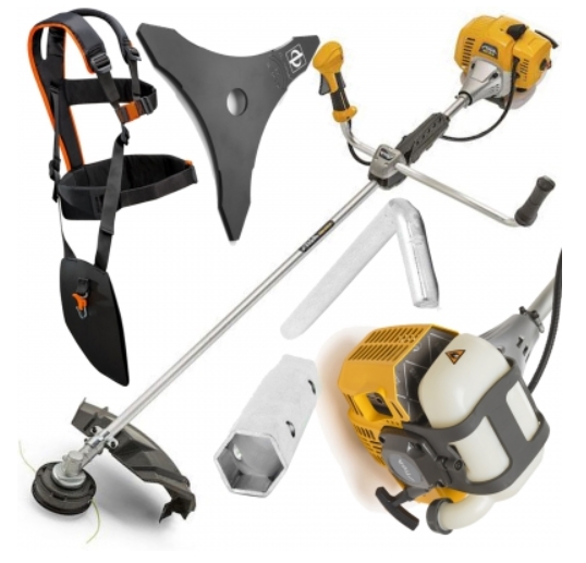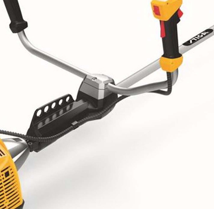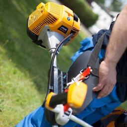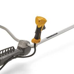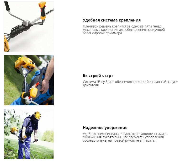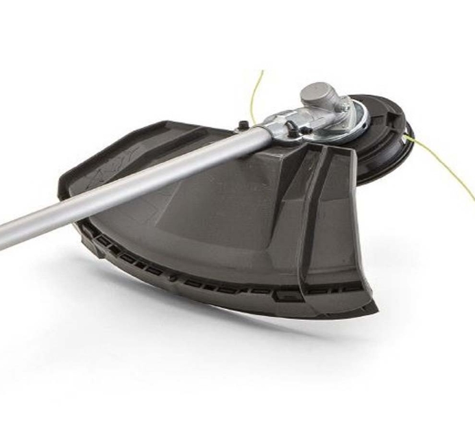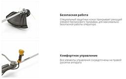 Рукоятка эргономичной формы имеет прорезиненные вставки и предотвращает случайное соскальзывание. Все элементы управления сосредоточены на правой ручке, что обеспечивает дополнительный комфорт во время работы. Защитный кожух надежно закрывает режущую насадку и предотвращает травмирование. Рабочая ширина бензинового триммера составляет 45 см.