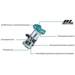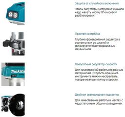 Аккумуляторный фрезер Makita DRT50ZJX2 представляет собой компактное удобное в использовании устройство. Оно служит для вырезания пазов, для создания бороздок и для выполнения некоторых других операций, для которых обычно применяется подобная техника. Глубина погружения у этого агрегата достигает 40 мм. Размер цанги у него 6 – 8 мм. Что касается количества оборотов в минуту, то данный параметр регулируется от 10000 до 30000.