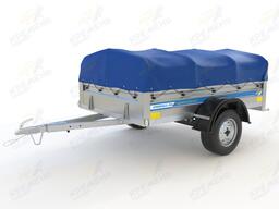 Прочные рессоры позволяют преодолевать любые ухабы на дороге без ущерба для груза. В комплект прицепа входит непромокаемый тент из ПВХ высотой 30 см от борта. Прицеп оборудован стандартным набором световых приборов, это комбинированные фонари, поворотники, стоп-сигнал, светоотражающий треугольник. Светотехника польской фирмы Fristom. На полу влагостойкая фанера толщиной 6 мм, ламинированная и многослойная, покрытие противоскользящее.