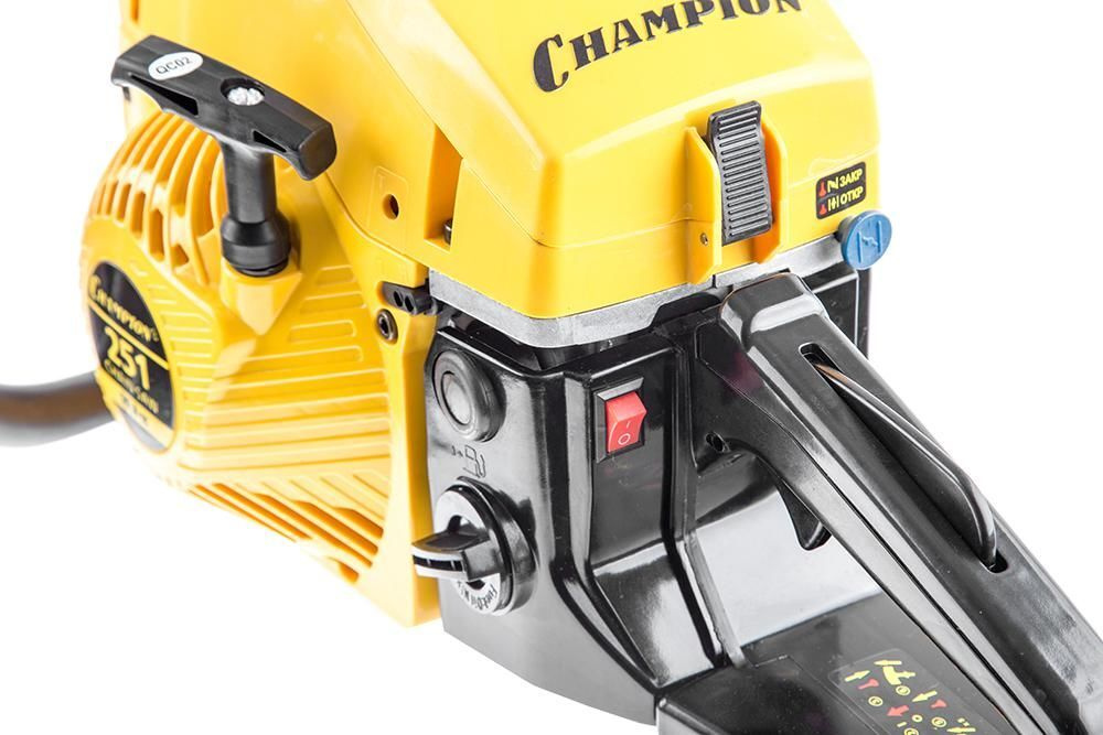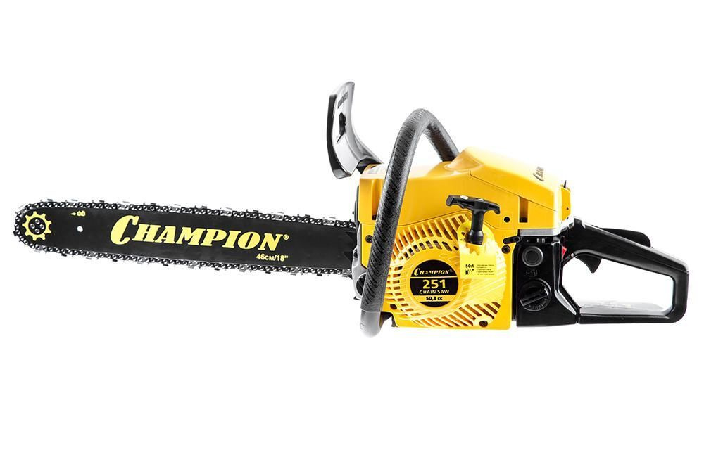 CHAMPION 251 - это легкая бытовая пилу для работ в саду, небольшого строительства или ремонта. Заготовка дров, удаление сухих веток и сучков, распиловка строительных материалов и валка садовых деревьев - простая задача для бензопилы CHAMPION 251.