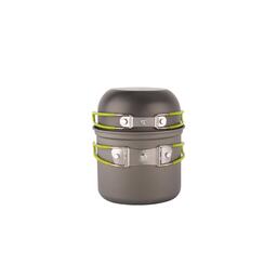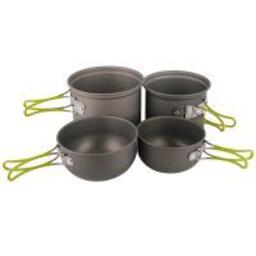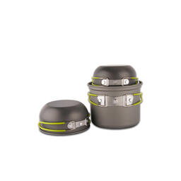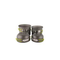 Набір посуду для туризму та активного відпочинку в оточенні природи. Він включає в себе пару каструльок і два невеликих ковша. Зручні ергономічні ручки для захоплення і утримання посуду. Цей комплект розрахований на компанію з 2-3 осіб. Посуд виготовлений із застосуванням високоякісного сплаву алюмінію. Обробка методом анодного окислення. Такий матеріал гарантує виробів міцність, зносостійкість, стійкість до пошкоджень, подряпин. До того ж, набір легко мити, коли в цьому виникає необхідність. Посуд добре адаптована до польових умов, її оптимально застосовувати під час відпочинку на свіжому повітрі.