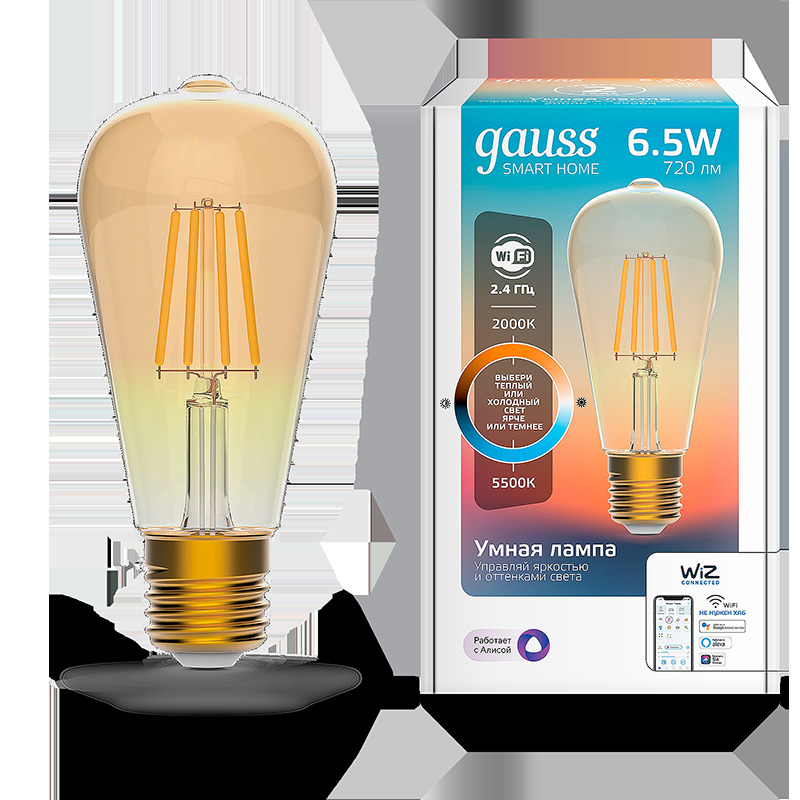 Gauss Лампа светодиодная филаментная Smart Home DIM+CCT E27 ST64 Golden 6,5 Вт 2000-5500 К 1/10/40 1310112