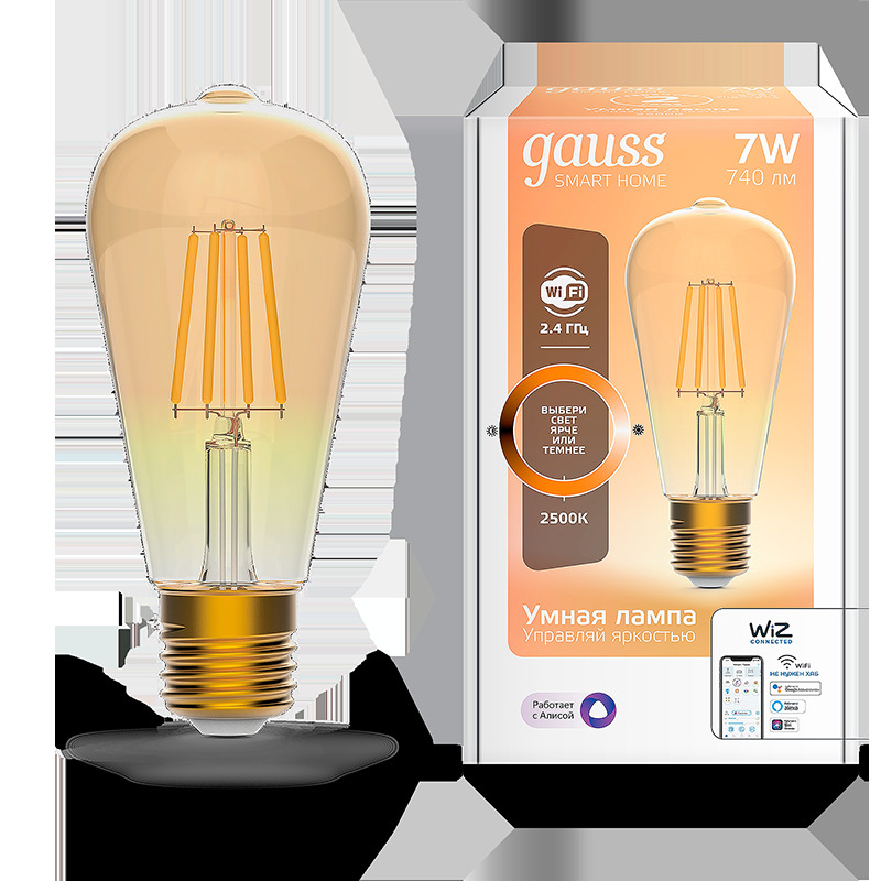 Помимо филаментных ламп в ассортименте бренда представлены и другие умные устройства, среди которых: лента, датчик движения, розетка, светодиодные лампы, а также встраиваемые и накладные светильники. Управляйте светом – управляйте вдохновением вместе с Gauss