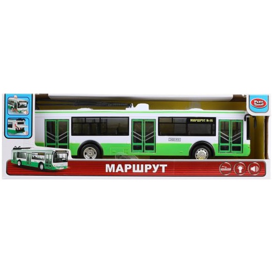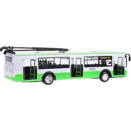 Высоко детализированная игрушка "Троллейбус" выполнена в масштабе 1:43. В ней предусмотрены подвижные детали: штанги-"рога" поднимаются и отпускаются, двери салона и багажный отсек открываются и закрываются. При открытии дверей и отсека слышатся реалистичные звуки, музыка и фразы на русском языке, сопровождаемые подсветкой игрушки.