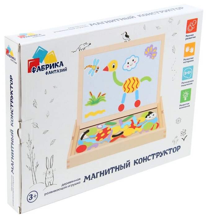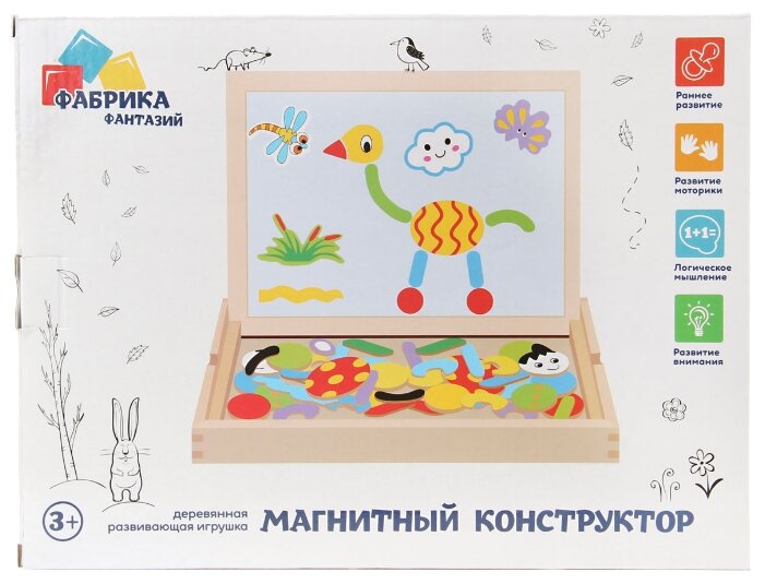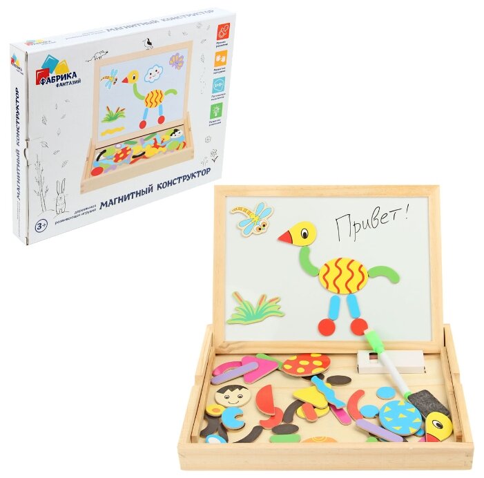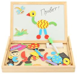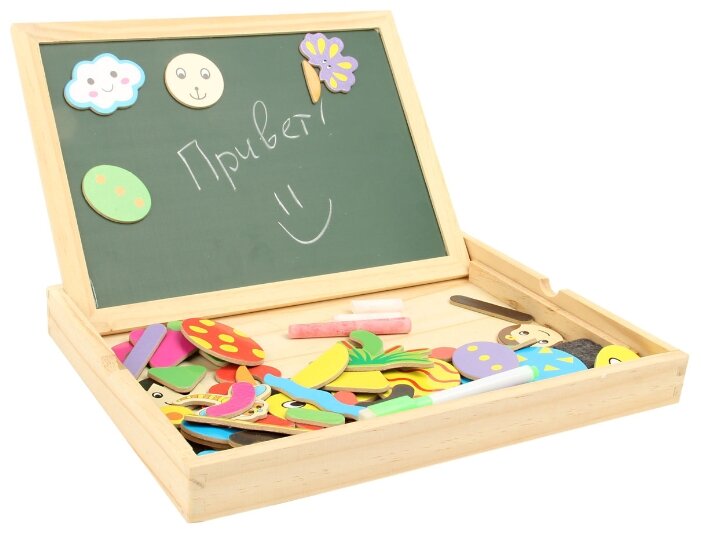 Дополнительная информациядвусторонняя магнитная доска для рисования маркером и мелом, разноцветные фигурки на магнитах, 2 мелка, маркер, и губка, всего 75 деталей
