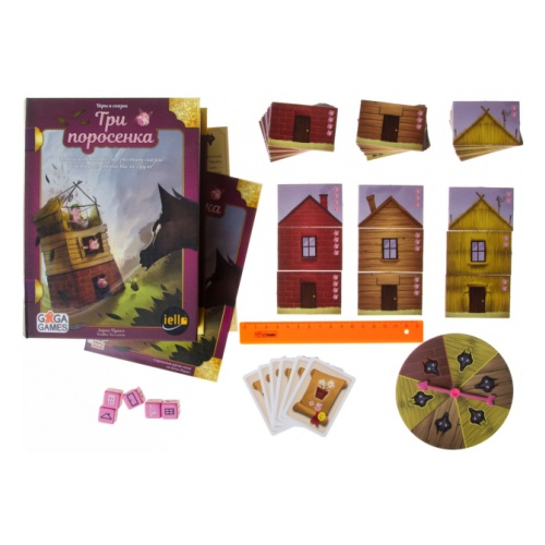 Каждый игрок может перебросить непонравившийся результат, чтобы собрать нужную комбинацию и получить соответствующую часть дома. Но если на кубиках показалась серая мордашка волка, над домами ваших соперников нависла угроза. Крутите специальный диск и сносите неустойчивые конструкции из соломы, дерева или даже кирпича. А чтобы как следует повеселиться, разрушая дома других игроков, дуйте на стрелку, а не вращайте ее рукой.