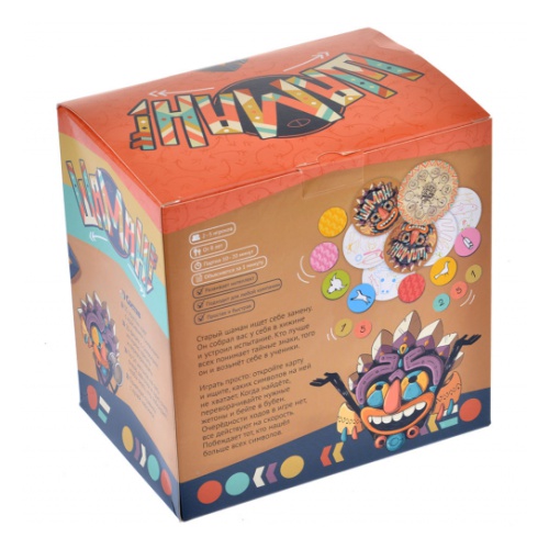 В этой красивой жестяной баночке — увлекательная игра на скорость и внимательность. Всё очень просто: перед вами и другими детьми племени лежат десять символов. А в центре стола — карточка с теми же символами, но их восемь. Как только вы поняли, каких двух символов не хватает, бейте в бубен и кричите: «Шаман!» Самые внимательные и быстрые накопят больше всех очков и станут настоящими вождями.