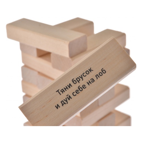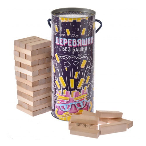 Настольная игра MAGELLAN Деревяшки Без БашниПеред вами уже успевшая стать классикой вечеринок настольная игра "Деревяшки". На этот раз уточнение "Без башни" как бы намекает на то, что в процессе игры нужно будет отринуть все свои комплексы и сомнения и оттянуться на полную катушку, заряжая атмосферу безудержным весельем!В самом начале, как обычно, из деревянных брусков выстраивается вертикальная конструкция посредством выкладывания брусков по три штуки, поперёк, ряд за рядом. Башня готова, зовите друзей, пора начинать!Игроки по очереди вытаскивают по одному брусочку и ставят на самый верх башни, но, как вы догадываетесь, это не было бы так просто. Дело в том, что на каждом бруске написано весёлое задание, которое не каждому под силу выполнить. Согласитесь, сложно совершить ход, пока о тебя трётся ногой соседний игрок? А как насчёт выдать во время хода весь свой имеющейся запас бранных слов или же станцевать в полуприседе?По очереди выполняя такие задания, вполне можно и забыть о первоначальной цели игры – построить башню как можно выше, и при этом не разрушить её. Хотя, стоит признать, что это рано или поздно произойдёт. И тот игрок, в чей ход ваша конструкция рассыпется на части, объявляется проигравшим, и может сам себе придумать "штрафное" задание, чтобы повеселить всю честную компанию. Ну, и, разумеется, выстроить башню заново, чтобы сыграть реванш!