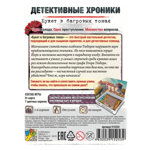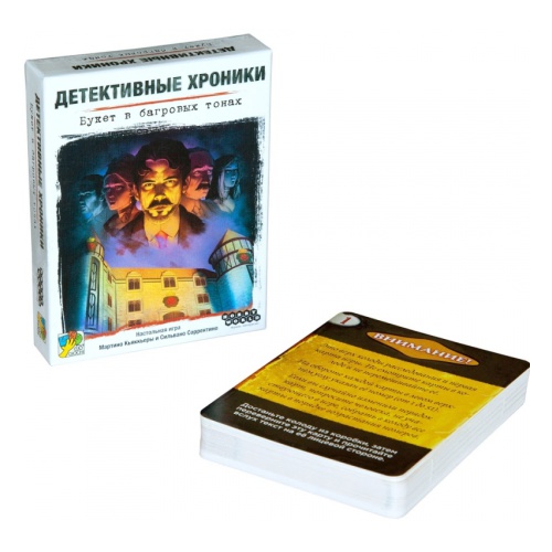 Настольная игра HOBBY WORLD Детективные хроники: Букет в багровых тонахШум кареты нарушает тишину, окружающую особняк Тюдоров. Только что прибывший Герцог Эдвард Йорк, делает ужасное открытие: граф Фердинанд Тюдор лежит безжизненно рядом с кустом кровавых роз. Что случилось? Это трагическая случайность или жестокое преступление? Соберите улики: сломанные карманные часы, руководство по астрологии, выигрышный билет на скачки. Можете ли вы собрать все доказательства вместе, чтобы разгадать тайну?Об игре"Детективные хроники: Букет в багровых тонах" – это игра о совместном расследовании, в которой рассказывается о произошедшем преступлении. Игроки должны сообща раскрыть загадочный случай. Они разыгрывают свои карты, чтобы делиться информацией, сбрасывают карты, которые, по их мнению, приведут их в неправильное русло, обсуждают найденные улики, делают гипотезы и выводы, чтобы найти решение!Как играть?Колода карт расследования кладётся в центре игрового стола. Карты в колоде нельзя перемешивать и подсматривать, игра начинается с верхней карты. Прочитайте текст на первой карте. В начале игры участники соберут из коробки объёмное место преступления, а далее игра сама расскажет вам, что делать дальше, и в какой последовательности.В свой ход игроки либо разыгрывают карту из руки и кладут её на стол лицевой стороной вверх, делясь информацией о ней, либо сбрасывают карту из своей руки в архив и не рассказывают о ней до конца расследования. Каждая карта имеет значение от 1 до 10 в левом верхнем углу. Карту можно разыгрывать на столе лицом вверх, только если её значение равно или меньше текущего количества карт в архиве.Кто победил?В конце игры игроки должны будут ответить на несколько вопросов касаемо совершённого преступления, чтобы доказать, что они правильно распутали всю цепочку улик, доказательств и подозреваемых. Каждый правильный ответ приносит игрокам победные очки. Чем больше очков получают игроки, тем лучше их финальный результат.