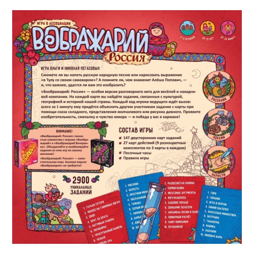 Настольная игра HOBBY WORLD Воображарий: Россия"Воображарий" – хорошо, а на русскую тематику – ещё лучше! Готовьте сарафаны, кафтаны, кокошники и балалайки, ведь впереди вас ждёт Тридевятое царство! Об игре"Воображарий: Россия" – это новая версия хита от мира настольных игр для вечеринок, посвящённая нашей необъятной стране. Проверьте свои знания истории, географии и культуры матушки-России. А помните ли вы все поговорки, песни, былины и сказки? Сможете за одну минуту объяснить задание другим молодцам и девушкам при помощи слов, жестов или рисунков? Есть отличная возможность это узнать и проверить, кто самый умный и премудрый удалец!Как играть?Сначала игроки выбирают уровень сложности карточек, по которым будет идти игра. После этого определяется первый игрок и начинается партия. В свой ход игрок должен взять две верхние карты из колоды и посмотреть на символ карты, оказавшейся наверху колоды (третьей по счёту). Этот символ укажет, какое именно слово на карте необходимо будет донести до слушателей. Игрок выбирает одну из двух карт, а также способ, с помощью которого будет объяснять карту. На выбор доступно три: рассказ, рисунок и представление. Выбирая тот или иной способ, игрок не может использовать его повторно до тех пор, пока не будут использованы все три типа. Таким образом в игре появляется стратегия: на каком слове лучше использовать рассказ, а на каком – рисунок? Всё зависит от вас!Далее засекается оговорённое время (обычно 1 минута). Как только время пошло – вашей задачей является проявить всё ваше мастерство, эрудицию и изобретательность, чтобы объяснить загаданное слово остальным игрокам. В случае успеха ведущий и отгадавший слово игрок получают победные очки.Кто победил?По договорённости игра завершается либо, когда в колоде заканчиваются все карты, либо, когда кто-то набирает определённое количество очков. В любом случае, побеждает тот игрок или команда, которая сможет набрать больше победных очков.