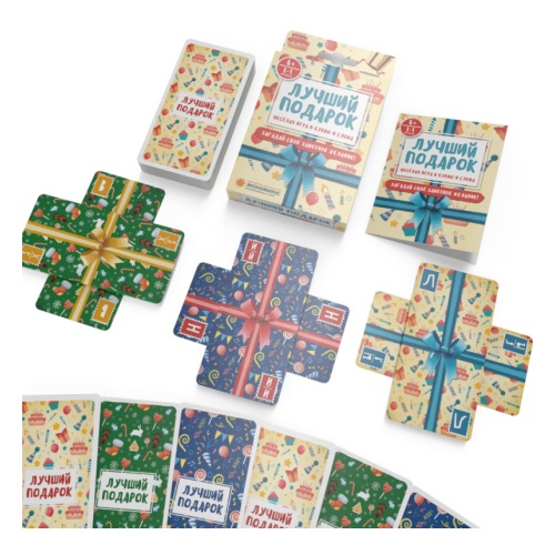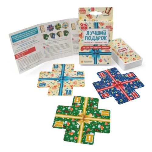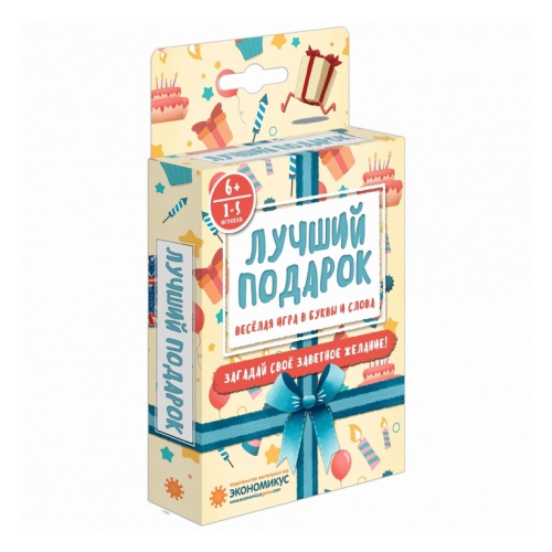 Настольная игра ЭКОНОМИКУС Лучший подарокПридумайте, какие подарки вы бы хотели получить или подарить своим друзьям! Можно загадать все что угодно... но из разыгранных на столе букв!Подготовка к игреВ центре стола выкладывается 3 пары карт, каждая пара «крестом». Игроки получают по 7 карт.Первый ход делает игрок, готовый использовать наибольшее число карт.Цель игры — первым избавиться от всех карт в руке.Ход игрыВ свой ход игрок играет любое число карт одного цвета, назвав слово, которое обязательно включает буквы всех карт этого цвета: сыгранных игроков и видимых в центре стола (но может содержать и любые другие дополнительные буквы). Слово должно описывать, какой подарок игрок хотел бы получить или подарить.Затем игрок размещает сыгранные карты поверх любых карт в центре стола, строго «поперек» верхних — так, что в каждой стопке всегда остаются видны только 2 верхние карты, лежащие «крестом».Сыграв больше 1 карты из руки, игрок добирает 1 карту с верха колоды.Если сыграв карты, игрок остался без карт в руке — он побеждает.