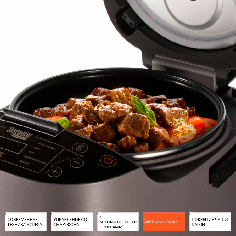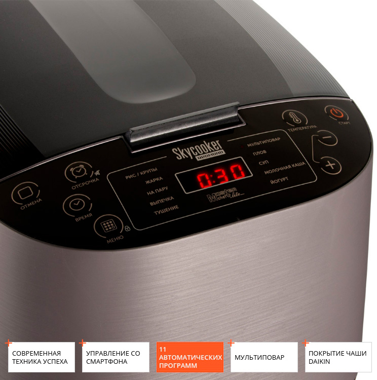 • Режимы работы Выпечка; Гречка; Жарка; Йогурт; Каша; Молочная каша; Приготовление на пару; Рис; Суп; Тушение
