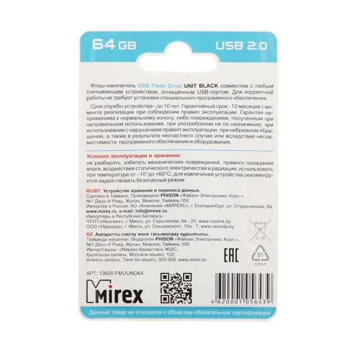 Флешка mirex unit black, 64 гб, USB2.0, чт до 25 мб/с, зап до 15 мб/с, черная