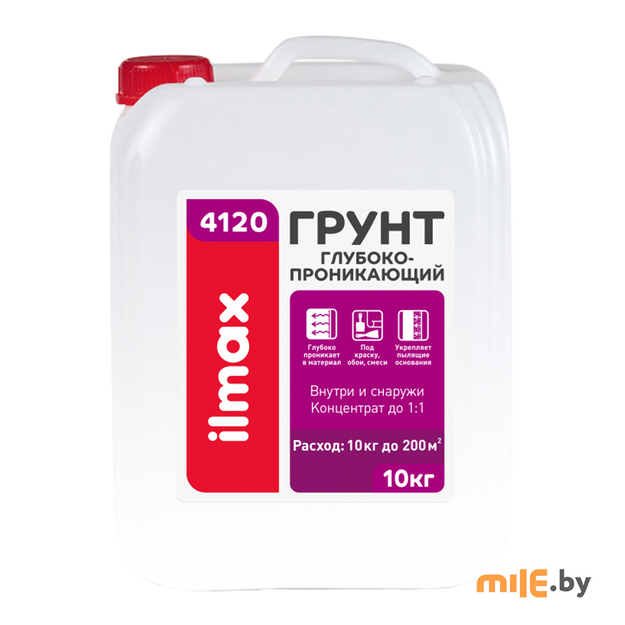Грунт Ilmax 4120 предназначен для грунтования минеральных оснований: бетон; цементные, цементно-известковые, гипсовые штукатурки; кирпич и блоки из ячеистого бетона; гипсокартонные и гипсоволокнистые листы; цементные и гипсовые стяжки. Перед укладкой последующих покрытий: клеевых и ремонтных растворов; штукатурок, шпатлевок, красок; стяжек, самонивелирующихся растворов.