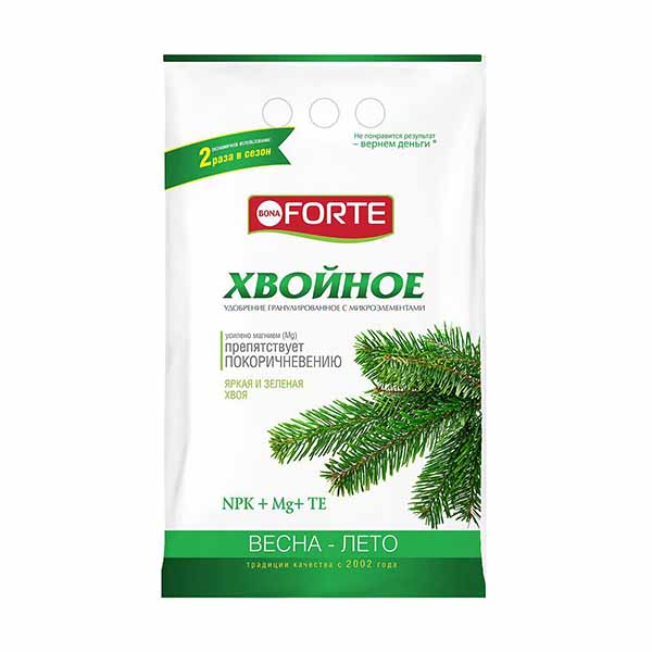 Удобрение комплексное гранулированное с микроэлементами Bona Forte для хвойных подходит для елей, сосен, кипарисов, тиса, кедра, можжевельника, туи, пихты, лиственницы и других хвойных растений. Препятствует покоричневению хвои, предотвращает осыпание иголок, поддерживает зеленый цвет хвои, подготавливает растение к зимовке.