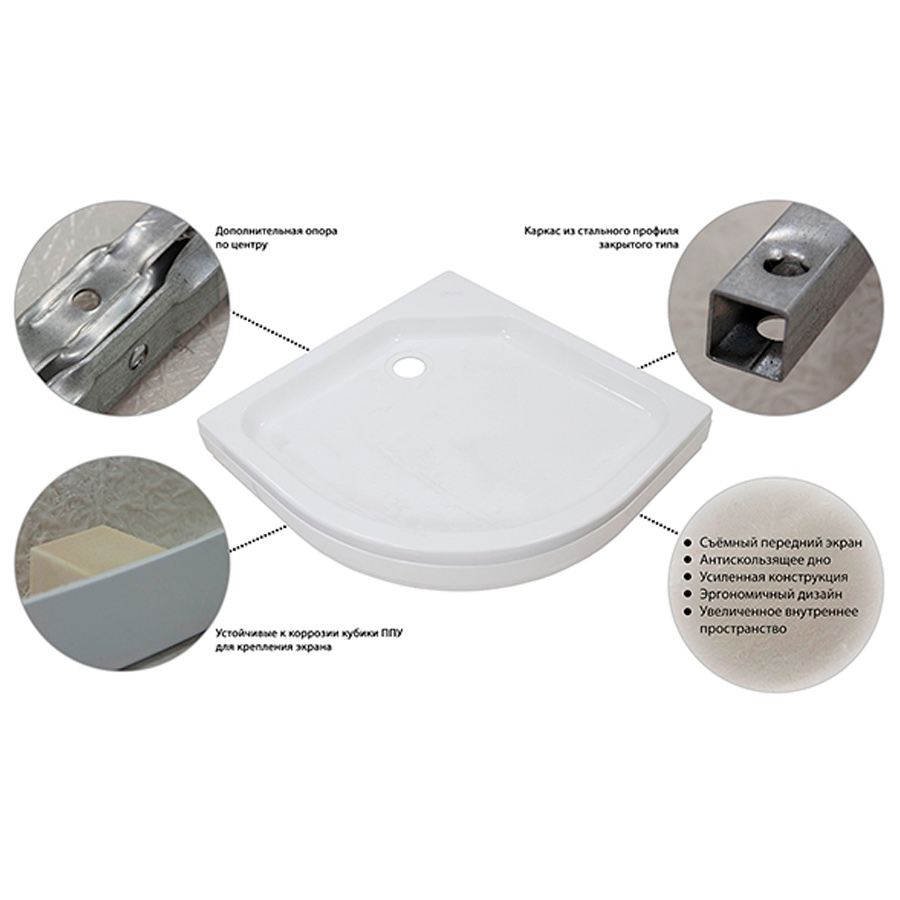 Акриловый полукруглый душевой поддон Triton – это угловая конструкция, которая характеризуется надежностью и устойчивостью за счет качественного акрила и прочных опор, входящих в комплект поставки. Форма полукруга экономит пространство ванной комнаты, а оптимальные габариты позволяют с комфортом провести время в душе. Модель характеризуется средней глубиной и противоскользящим рельефным дном, которое защищает пользователя от случайного падения.