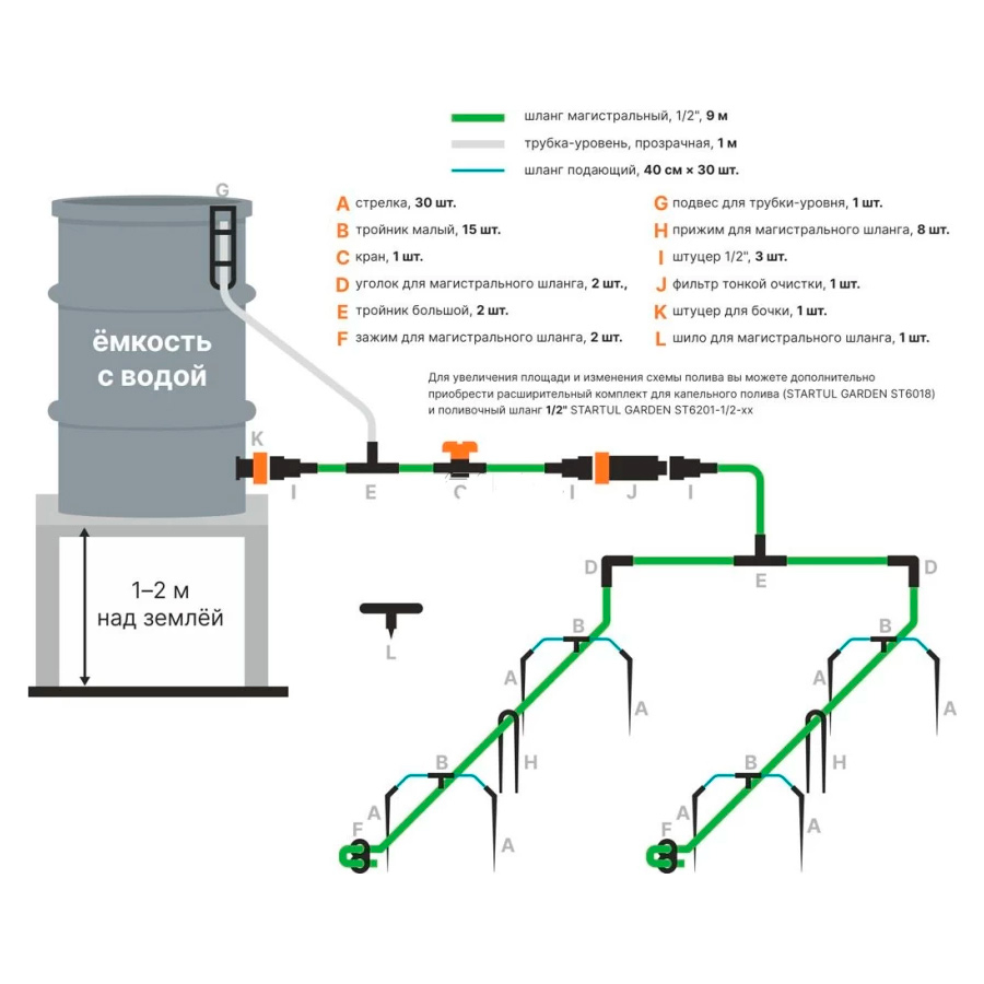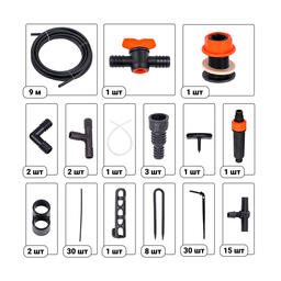 Расход воды на одно растение ~ 4 л/ч. Комплект поставки: шланг магистральный, 1/2" (18 м), трубка-уровень, прозрачная (1м), шланг подающий (40 см х 60 шт.), стрелка (60шт.), тройник малый (30 шт.), кран (3 шт.), уголок для магистрального шланга (3 шт.), тройник большой (3 шт.), зажим для магистрального шланга (3 шт.), подвес для трубки-уровня (1 шт.), прижим для магистрального шланга (16 шт.), штуцер 1/2" (3 шт.), фильтр тонкой очистки (1 шт.), штуцер для бочки (1 шт.), шило для магистрального шланга (1 шт.), руководство по эксплуатации;