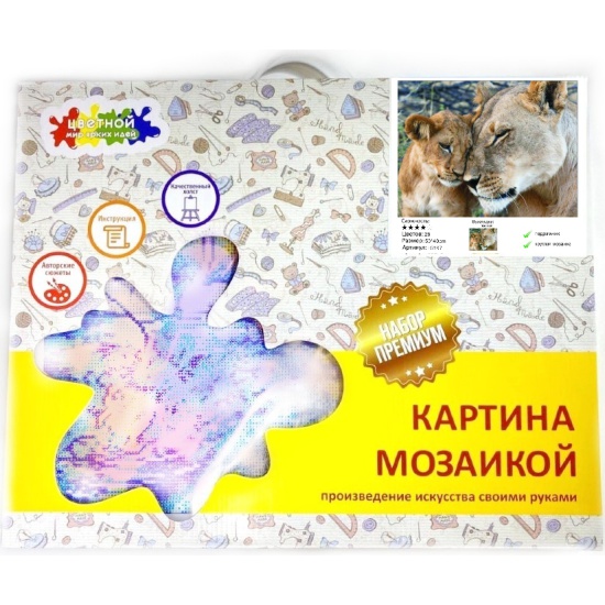 Алмазная мозаика ЦВЕТНОЙ LG197 Любовь львицыАлмазная мозаика на подрамнике имеет полную выкладку, круглые стразы. Холст с клеевым слоем, схемой выкладки картины и защитной пленкой натянуты на деревянный подрамник и приклеены к жесткой основе для удобства выкладки. В наборах ТМ Цветной используется мозаика на основе ювелирной смолы с алмазной огранкой 21 грань. За счет огранки и состава страз создается эффект блеска и переливов. Картина оформлена рамкой напечатанной на холсте и не требует дополнительного оформления в багет. Набор для создания картины из алмазной мозаики позволит создать прекрасный подарок или украшение для интерьера. В набор входит: Холст на подрамнике с клеевым слоем, защитной пленкой и схемой выкладки картины;Пронумерованные пакетики с алмазной мозаикой; Инструкция и лист со схемой выкладки мозаики;Стилус для захвата мозаики;Клей-липучка для стилуса; Пластиковый пинцет;Лоток для мозаики; Крепление на стену; Подарочная коробка с ручкой и кратким описанием набора.