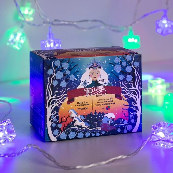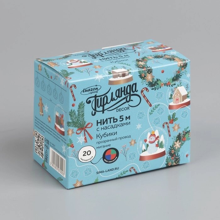 Гирлянда 'Нить' 5 м с насадками 'Кубики'IP20, прозрачная нить, 20 LED, свечение мульти, мигание, 220 В