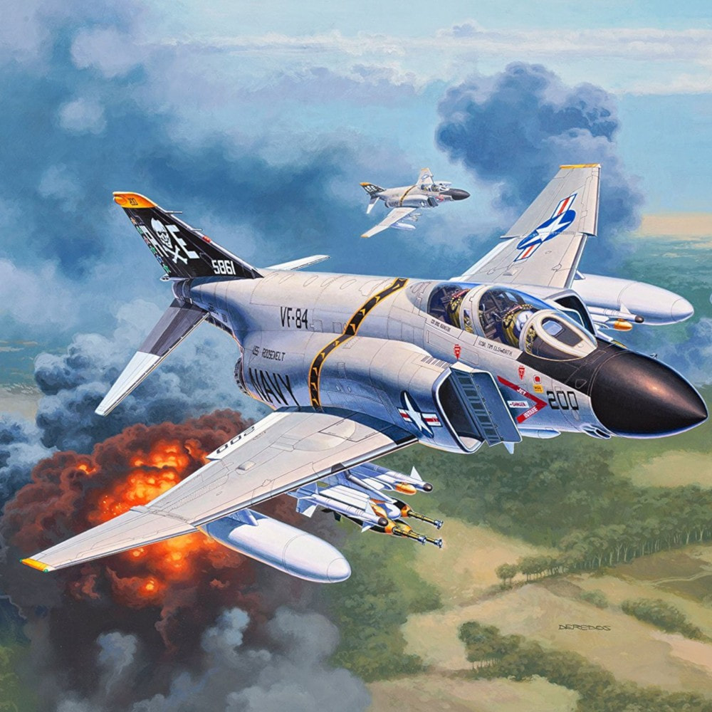Сборная модель истребителя-бомбардировщика F-4J Phantom II в масштабе 1:72. Истребитель служил военно-морскому флоту США в роли перехватчика и штурмовика.