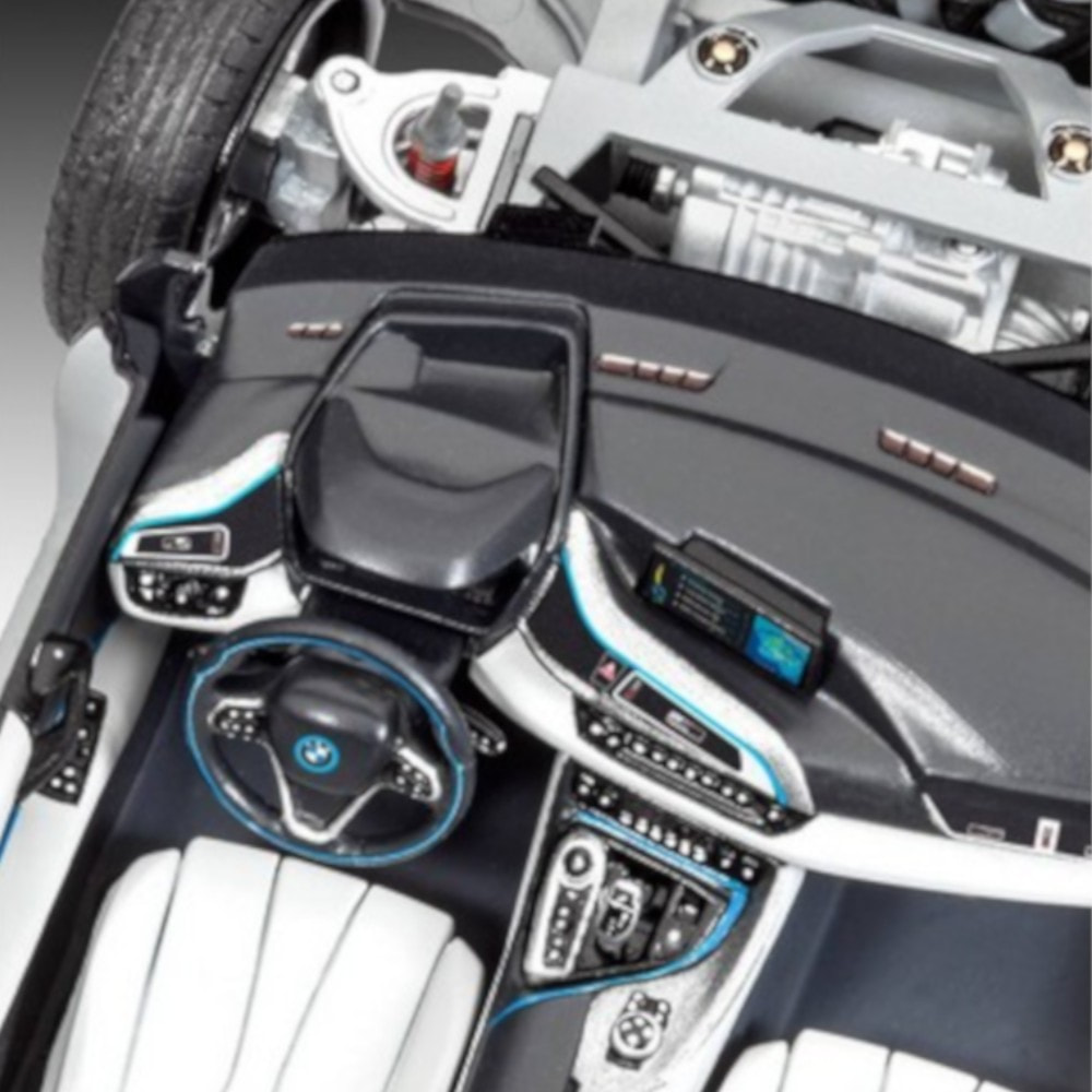 Сборная модель BMW i8 выполнена из пластика в масштабе 1/24. Для сборки вам потребуется клей. Для приклеивания стекол и фар рекомендуется использовать специальный клей для прозрачного пластика.