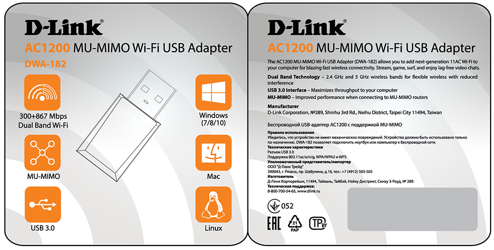 • Особенности Беспроводной двухдиапазонный USB 3.0 адаптер AC1200 с поддержкой MU-MIMO Встроенная антенна с коэффициентом усиления 2 dBi