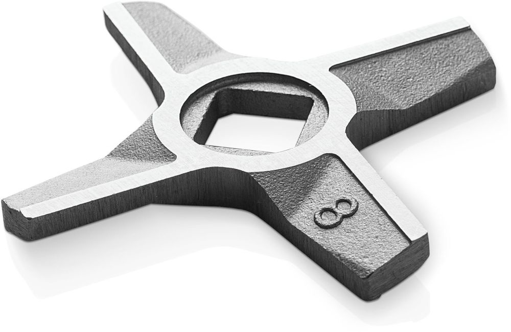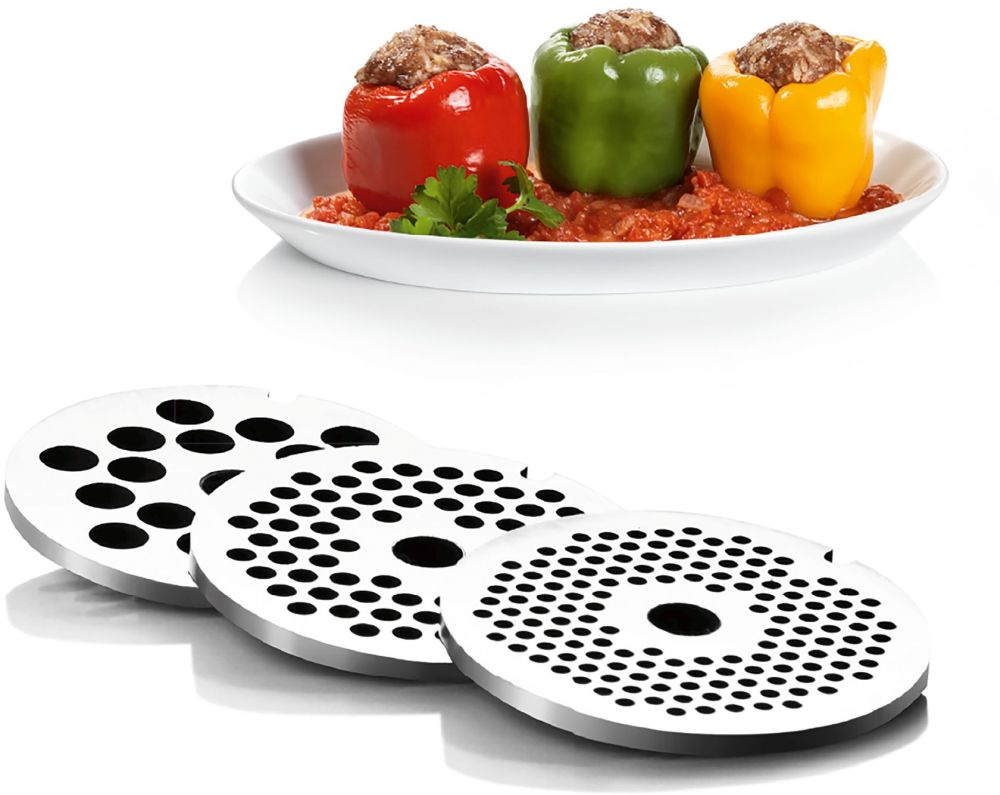 • Дополнительные насадки Три перфорированных диска с отверстиям 2,7 / 4 / 8 мм Насадка для колбас Насадка для шинковки – 4 барабана (3 терки, 1 шинковка)